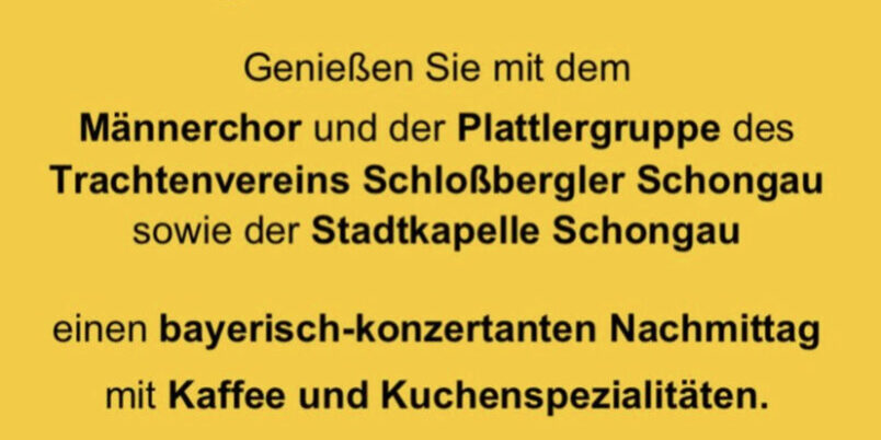 Wirkliche bayerische Tradition ist wieder in, und in Schongau haben wir Vereine, die diese seit Jahrzehnten leben. Die Stadtkapelle Schongau, der Männerchor der Schloßbergler und die Plattlergruppen des Trachtenvereins gestalten gemeinsam am 3. Oktober im Rahmen des KuKu-Festivals einen bayerischen Nachmittag im Jakob-Pfeiffer-Haus – mit einem richtig tollen Programm und hoffentlich vielen begeisterten Gästen. Das Festival steht unter dem Motto „ID- Identität“, und was könnte da besser passen als ein „Bayerischer Nachmittag – gelebte Tradition“? Traditionelles Liedgut trifft auf schneidige Plattler, Walzer, Polkas und Märsche – ein Querschnitt aus 100 Jahren gelebten Brauchtums.