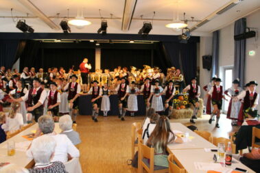 In zwei Stunden, die wie im Flug vergingen, präsentierten die Musiker der Stadtkapelle, der Schloßbergler Männerchor und die Plattlergruppen des Trachtenvereins einen Querschnitt aus 100 Jahren lebendigen Brauchtums. Alt, neu oder wiederentdeckt – wie beispielsweise der Vereinsschlag der Aktiven Plattlergruppe. „Dieser anspruchsvolle Plattler war viele Jahrzehnte nicht mehr im Repertoire, und wurde zum Gaufest 2008 quasi neu erfunden“, erklärte Schloßbergler-Vorstand Markus Wölfle, der zusammen mit Kathrin Beckstein informativ und unterhaltsam durch den Nachmittag führte.