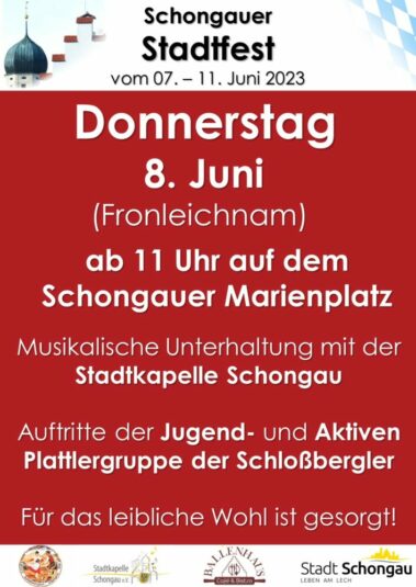 Fronleichnamsgottesdienst und -prozession um 9 Uhr in der Kirche Mariae Himmelfahrt. Die Vorstandschaft bittet um Teilnahme aller Mitglieder. Anschließend findet das Stadtfest auf dem Marienplatz statt.