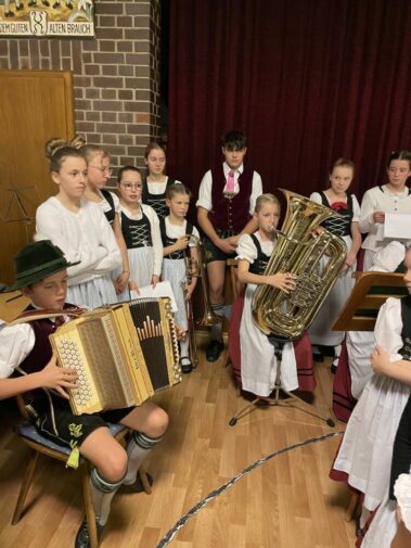 Wenn die Bäckchen des Trachtler-Nachwuchses rot werden und die Knie ein wenig zittern, dann kann das nur eins bedeuten: Der Hl. Nikolaus ist auf dem Weg ins Trachtenheim. Doch bevor dieser an die Tür klopfte, zeigten die Kinder der Plattlerjugend der „Schloßbergler“ erst einmal, dass sie nicht nur gut drehen und platteln können, sondern auch sehr musikalisch sind. Eine halbe Stunde lang wurde musiziert und gesungen – zur Begeisterung der mitgekommenen Eltern, Großeltern und Geschwister. Vielleicht auch, um den heiligen Mann milde zu stimmen, denn es wusste ja keiner, was dessen Engel ihm geflüstert hatten. Das war jedoch gar nicht nötig, denn der Nikolaus hatte fast nur Positives über alle Kinder, Jugendleiter und Vereinsmusikanten zu berichten. So musste auch der Knecht Ruprecht beinahe keine „Gedächtnisstütze“ verteilen. „Es ist wirklich schön zu sehen, wie begeistert ihr bei der Trachtensache seid. Macht weiter so!“, lobte der Nikolaus. Und als Dank für ihre Treue bekamen alle noch einen süßen Klausenmann von ihm geschenkt.