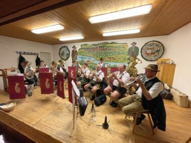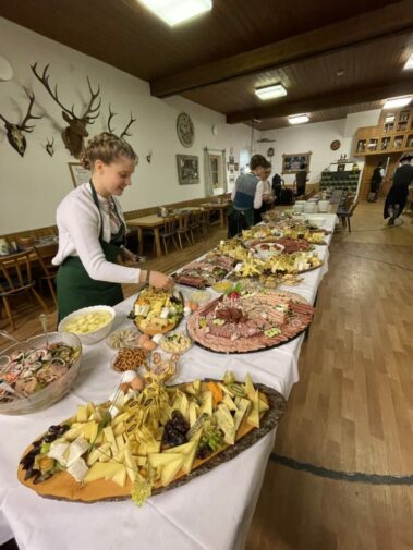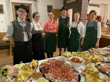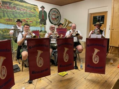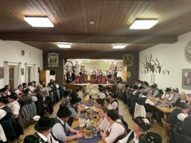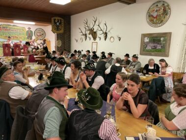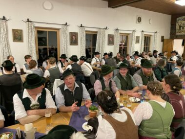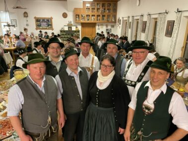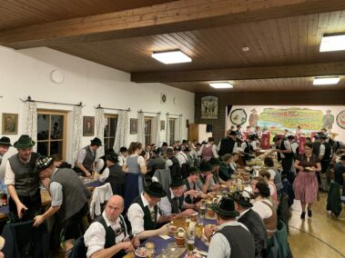 „Wir freuen uns total, dass unser Patenvereinstreffen heute stattfinden kann“, begrüßte Schloßbergler-Vorstand Markus Wölfle die zahlreichen Gäste – die Vorstände der sieben Vereine und deren Ausschüsse. „Das ist doch ein viel schöneres Geschenk als irgendeine Ehrengabe, die dann auf dem Dachboden landet“, meinte er lachend. Und das war es wirklich: Die Patenvereine hatten sich alle zusammengetan und ein phänomenales Brotzeit-Büffet gezaubert. Auch beim Bedienen, beim Ausschank und in der Küche halfen alle zusammen, so dass einem griabigen Abend, musikalisch umrahmt von der „Roattabuachar Bauramusi“, nichts mehr im Weg stand. Bis in die späten Abendstunden wurde geratscht und gelacht: Eine einmalige Veranstaltung mit absoluter Gute-Laune-Garantie.